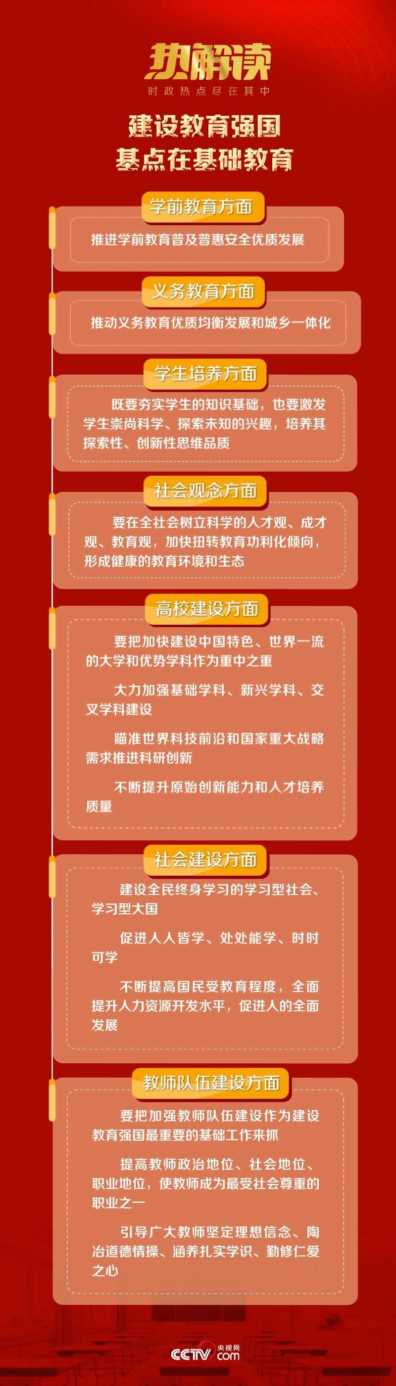 學(xué)前教育普及普惠安全優(yōu)質(zhì)發(fā)展;義務(wù)教育優(yōu)質(zhì)均衡發(fā)展和城鄉(xiāng)一體化;在全社會樹立科學(xué)的人才觀、成才觀、教育觀……這些始終是總書記關(guān)心的重點(diǎn)。做什么、怎么做,總書記明確給出了推動基礎(chǔ)教育、加快建設(shè)高質(zhì)量教育體系的方法路徑。