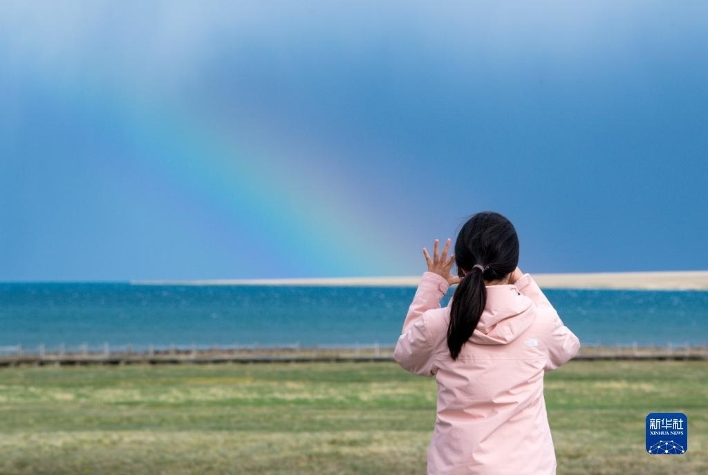 游客在新疆賽里木湖邊拍攝彩虹(5月21日攝)。新華社記者 王菲 攝