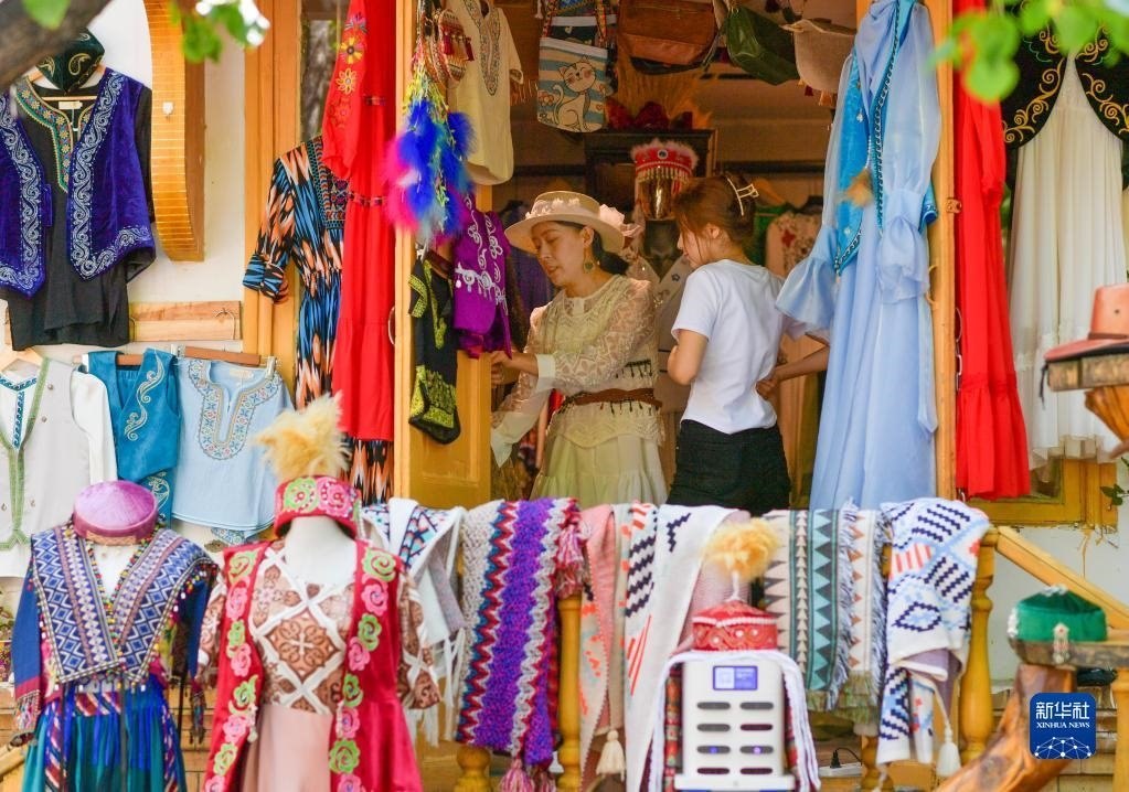 游客在新疆伊寧市六星街挑選民族服飾(5月17日攝)。新華社記者 王菲 攝