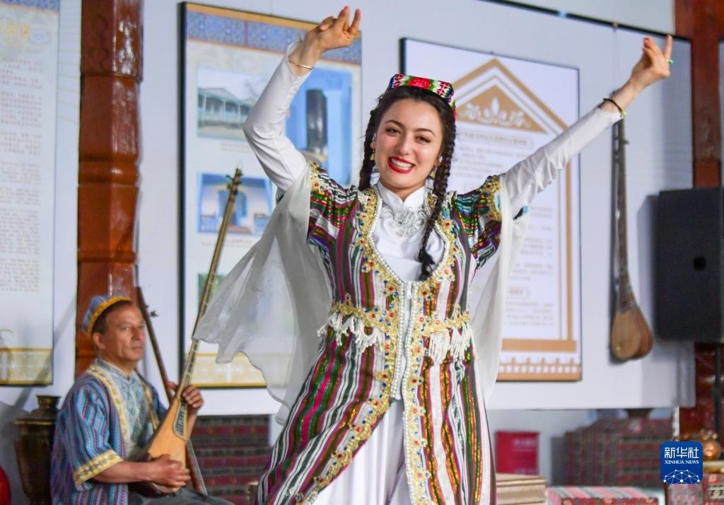 演員在新疆伊寧市喀贊其景區(qū)為游客表演“埃希來(lái)、葉來(lái)(一種烏茲別克族的民間傳統(tǒng)樂(lè)舞)”(5月18日攝)。新華社記者 王菲 攝