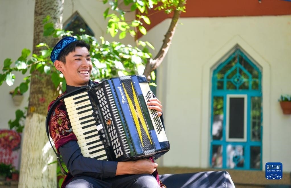 一名樂(lè)手在新疆伊寧市六星街街頭準(zhǔn)備演奏手風(fēng)琴(5月17日攝)。新華社記者 王菲 攝
