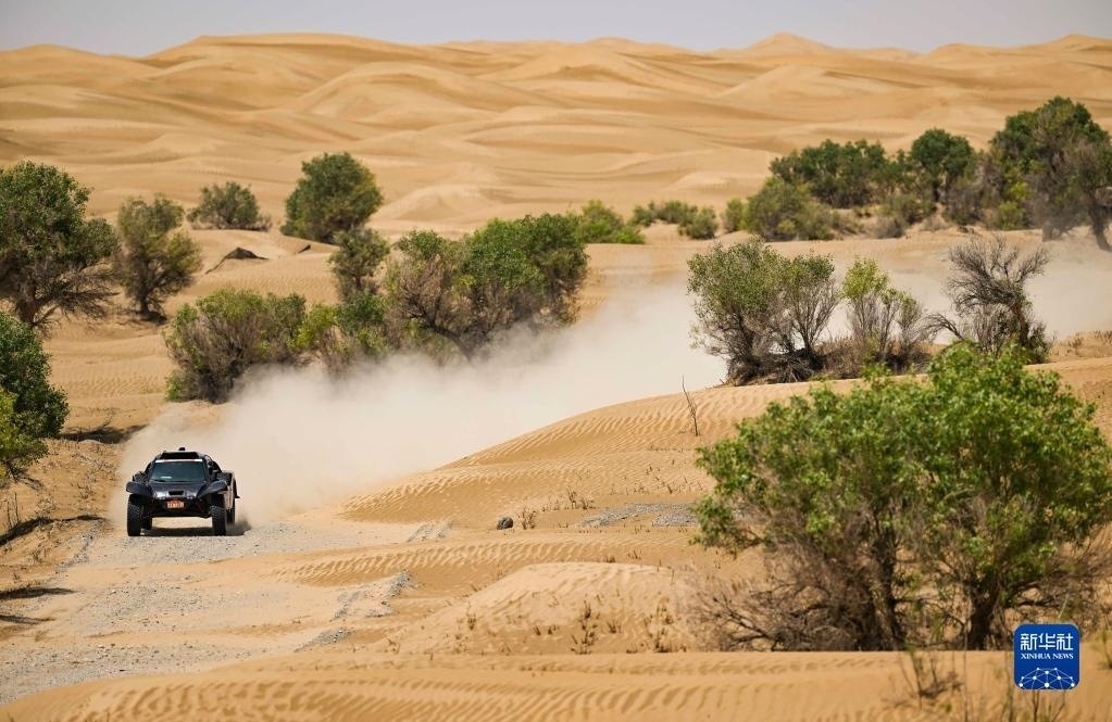 參與2023年中國(guó)環(huán)塔(國(guó)際)拉力賽的車(chē)手駕駛賽車(chē)疾馳在新疆和田地區(qū)墨玉縣的沙漠中(5月28日攝)。 新華社記者 胡虎虎 攝
