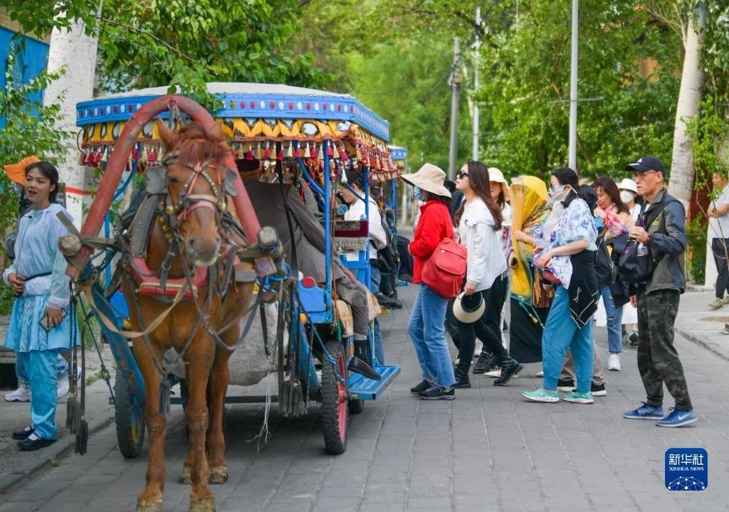 游客在新疆伊寧市喀贊其景區(qū)準(zhǔn)備乘坐馬車(chē)觀光(5月18日攝)。新華社記者 王菲 攝