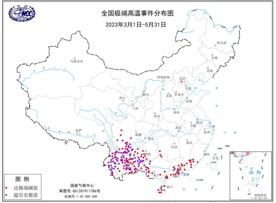 圖3 2023年春季全國(guó)極端高溫事件分布圖