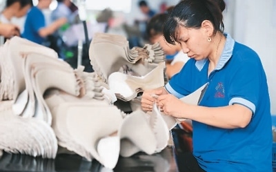 今年以來,福建省福州市倉山區(qū)持續(xù)優(yōu)化營商環(huán)境,進(jìn)一步加大出口退稅支持力度,為企業(yè)提供精準(zhǔn)服務(wù),助力出口外貿(mào)企業(yè)積極開拓海外市場。圖為倉山區(qū)一家鞋企生產(chǎn)車間內(nèi),工人在生產(chǎn)出口女靴。