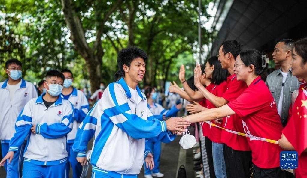 6月7日,在吉林省長(zhǎng)春市五十六中學(xué)考點(diǎn),考生入場(chǎng)前與送考老師擊掌。