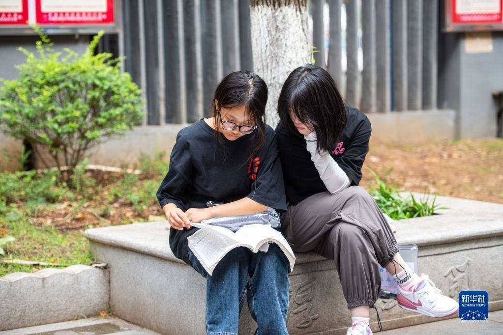6月7日,在湖南長(zhǎng)沙市第一中學(xué)考點(diǎn),考生在考場(chǎng)外復(fù)習(xí)。
