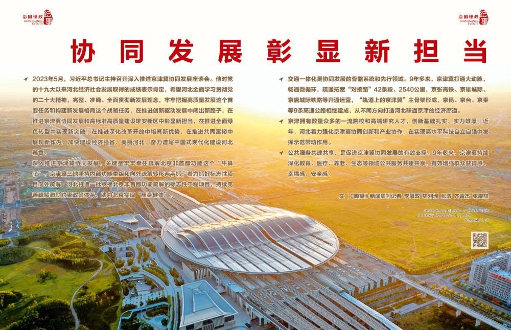 ◇2023年5月,習近平總書記主持召開深入推進京津冀協(xié)同發(fā)展座談會。他對黨的十九大以來河北經(jīng)濟社會發(fā)展取得的成績表示肯定,希望河北全面學習貫徹黨的二十大精神,完整、準確、全面貫徹新發(fā)展理念,牢牢把握高質(zhì)量發(fā)展這個首要任務(wù)和構(gòu)建新發(fā)展格局這個戰(zhàn)略任務(wù),在推進創(chuàng)新驅(qū)動發(fā)展中闖出新路子,在推進京津冀協(xié)同發(fā)展和高標準高質(zhì)量建設(shè)雄安新區(qū)中彰顯新?lián)?,在推進全面綠色轉(zhuǎn)型中實現(xiàn)新突破,在推進深化改革開放中培育新優(yōu)勢,在推進共同富裕中展現(xiàn)新作為,加快建設(shè)經(jīng)濟強省、美麗河北,奮力譜寫中國式現(xiàn)代化建設(shè)河北篇章。