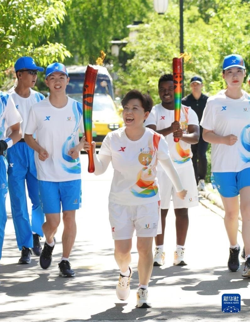 6月10日,火炬手丁寧(中)在火炬?zhèn)鬟f中。