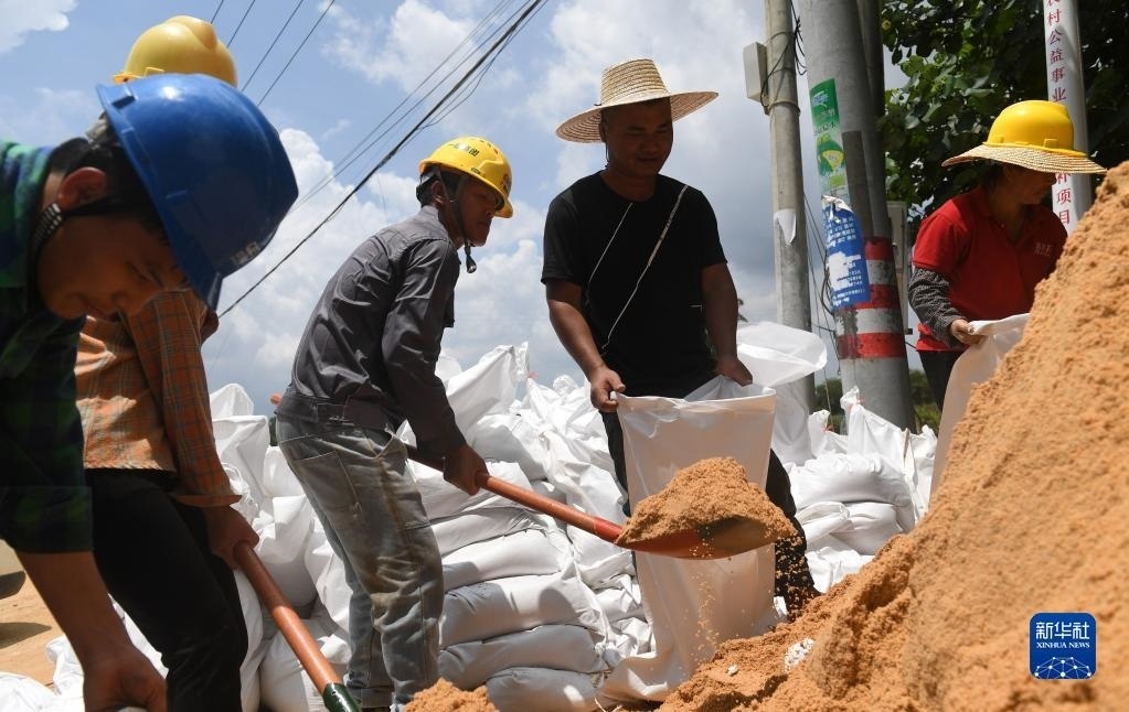 6月11日,在廣西合浦縣白沙鎮(zhèn),人們在裝沙子準(zhǔn)備修復(fù)遭洪水損毀的堤壩。
