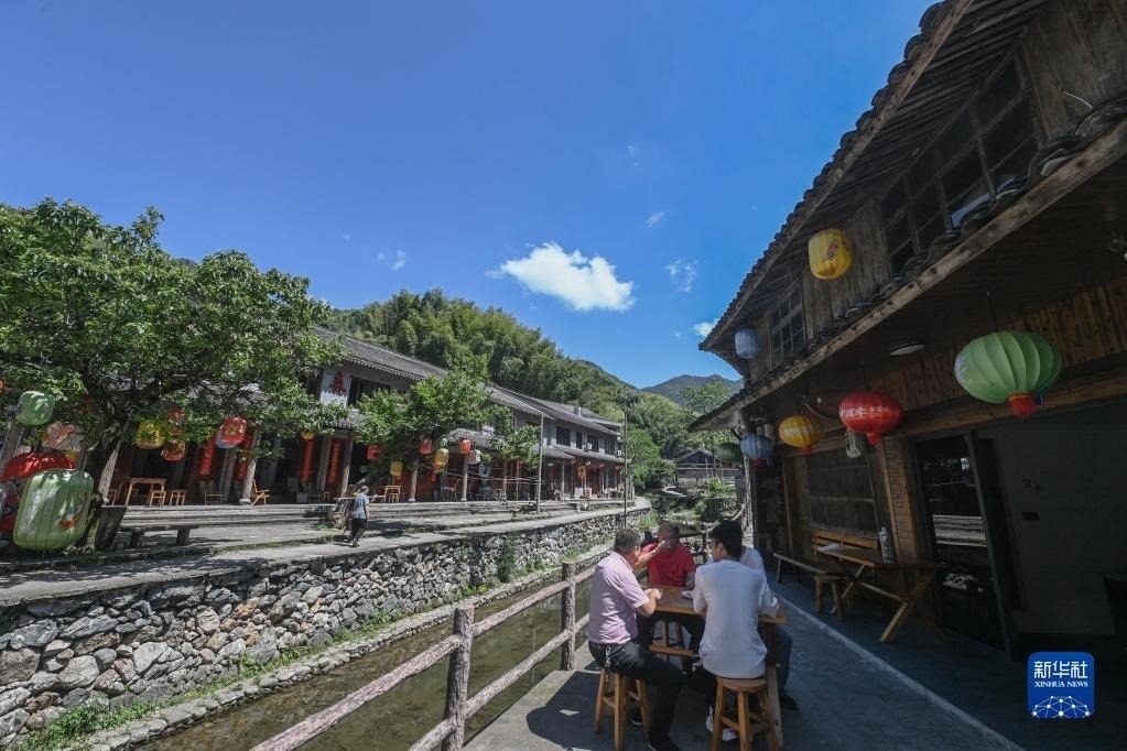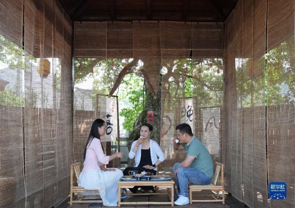 人們在浙江臺(tái)州黃巖區(qū)嶼頭鄉(xiāng)布袋坑村的溪水旁喝茶(5月30日攝)。近年來,嶼頭鄉(xiāng)堅(jiān)持黨建引領(lǐng),以全域旅游和美麗鄉(xiāng)村建設(shè)為重要抓手,引進(jìn)文化創(chuàng)意團(tuán)隊(duì),為鄉(xiāng)村旅游注入更加年輕化的元素,推進(jìn)特色民宿以及布袋山饅頭、溪坑魚等農(nóng)特產(chǎn)品的發(fā)展,帶動(dòng)鄉(xiāng)村振興和百姓共富。新華社記者 徐昱 攝