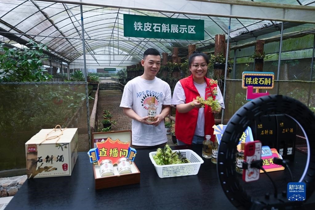 在浙江諸暨東白湖鎮(zhèn)的鐵皮石斛有機(jī)種植基地,東白湖鎮(zhèn)黨員志愿者(右)和基地負(fù)責(zé)人一起直播銷售鐵皮石斛花茶、鐵皮石斛酒等產(chǎn)品(6月8日攝)。近年來,東白湖鎮(zhèn)著力發(fā)展鐵皮石斛等特色農(nóng)業(yè)產(chǎn)業(yè),加快農(nóng)業(yè)數(shù)字化轉(zhuǎn)型,推進(jìn)農(nóng)特產(chǎn)品交易服務(wù)中心、惠農(nóng)綜合平臺(tái)以及直播經(jīng)濟(jì)的發(fā)展。新華社記者 徐昱 攝