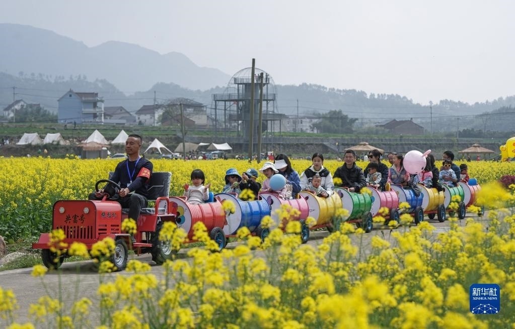 在浙江杭州臨安區(qū)青山湖街道郎家村“共富稻田”,游客乘坐田野小火車在油菜花地里感受春日美景(4月1日攝)。“共富稻田”定位多功能田園農(nóng)旅綜合體,陸續(xù)打造了妙哉花園、稻田觀光道、稻田餐廳、稻田茶吧等鄉(xiāng)村旅游特色節(jié)點(diǎn),吸引城市居民前來體驗(yàn)戶外農(nóng)田生活。新華社記者 徐昱 攝