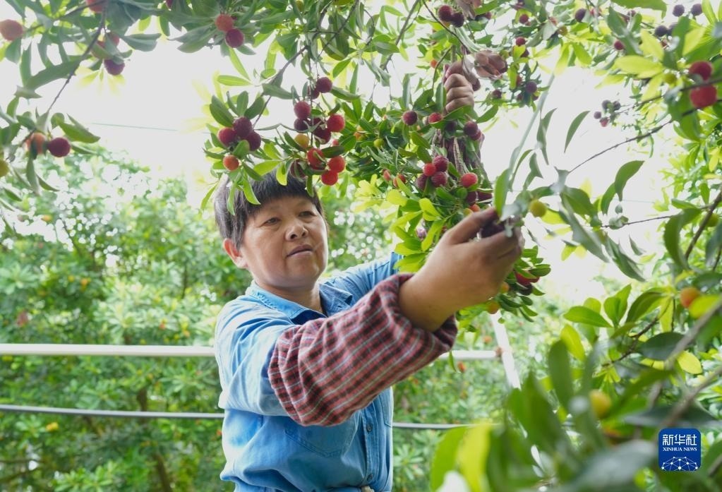 在浙江余姚三七市鎮(zhèn),果農(nóng)陳利平在采摘楊梅(6月1日攝)。她和丈夫鄭通海在承包的楊梅山上建起保溫大棚,上市時(shí)間比露天楊梅提前不少。新華社記者 翁忻旸 攝