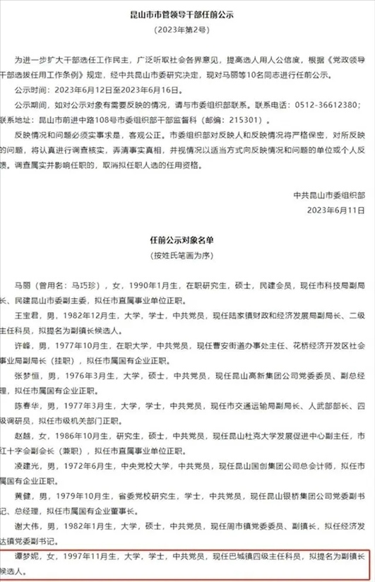 ·中共昆山市委組織部干部監(jiān)督科回應(yīng)97年出生女子擬提名副鎮(zhèn)長(zhǎng):是按正常流程進(jìn)行,有問(wèn)題可以監(jiān)督舉報(bào)。