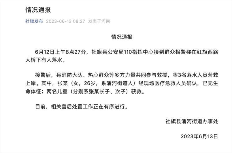 ·網(wǎng)傳南陽(yáng)26歲媽媽帶2幼兒跳河,官方通報(bào):女子已離世,兩名兒童獲救。