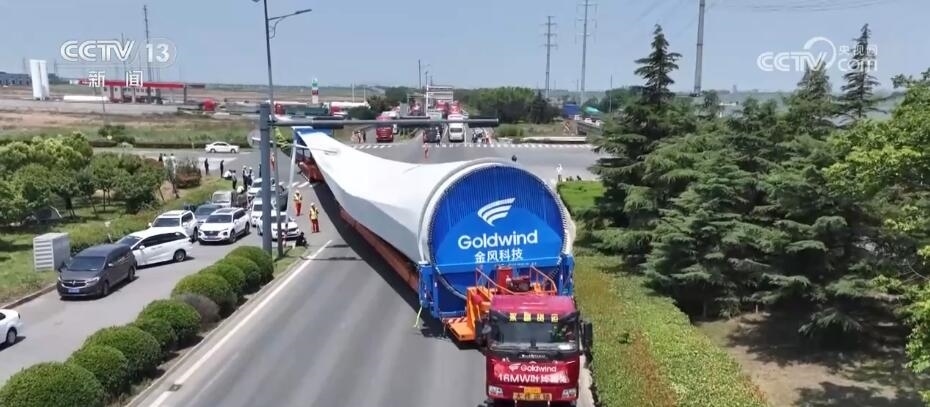 央視網(wǎng)消息:今天(6月14日)上午,100%我國自主知識產(chǎn)權(quán)的123米超長海上風(fēng)電葉片在江蘇連云港啟動陸地轉(zhuǎn)運(yùn)工作。上午9時(shí),代表著我國風(fēng)電裝備最新技術(shù)水準(zhǔn)的大葉片,從廠區(qū)到港口碼頭,陸地運(yùn)輸全程約30公里,耗時(shí)約3到4個(gè)小時(shí),其中運(yùn)輸大葉片的車輛還要拐過90度的直角彎。如此大體量的裝備運(yùn)輸是一個(gè)復(fù)雜的過程,其中有哪些技術(shù)難點(diǎn)?來看記者今天上午從現(xiàn)場發(fā)回的報(bào)道。