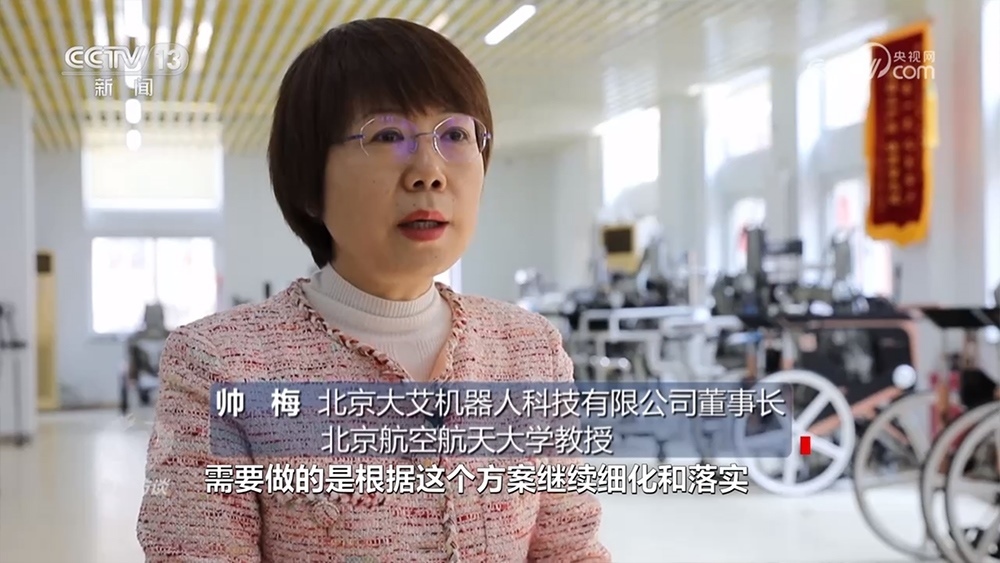 北京大艾機(jī)器人科技有限公司董事長、北京航空航天大學(xué)教授帥梅:“就是通過外骨骼機(jī)器人訓(xùn)練,來給他建立正確的行走模式,以及正確的本體感覺,讓他能重新行走?!?/p>