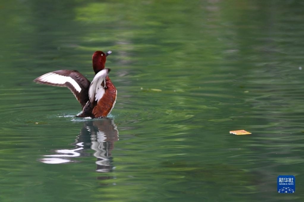 夏日里,白眼潛鴨和鳳頭潛鴨在西藏拉薩市拉魯濕地國家級自然保護(hù)區(qū)中干渠里覓食、嬉戲。新華社記者 張汝鋒 攝