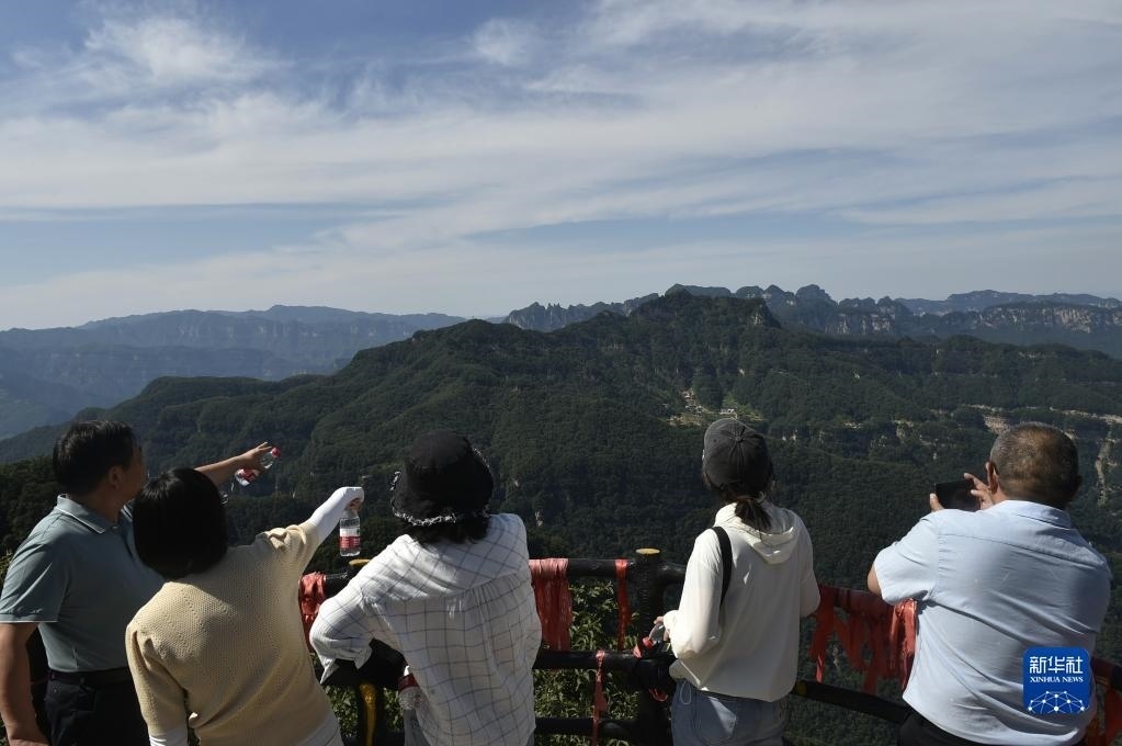 6月15日,游人在王屋山的一處觀景臺上賞景拍照。