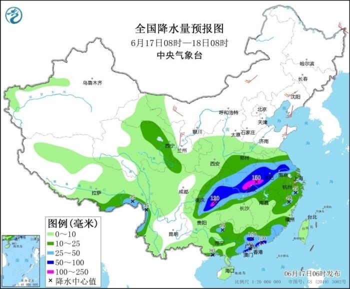 17日至19日,西南地區(qū)東部、江漢、江淮、江南、華南等地有大范圍較強降雨過程,部分地區(qū)有大到暴雨,局地大暴雨,并伴有短時強降水、雷暴大風等強對流天氣。其中,6月17日08時至18日08時,江淮大部、江漢大部、湖南北部、重慶中東部、貴州北部、廣西北部和南部沿海、廣東中南部、福建南部以及西藏東南部、云南西北部等地部分地區(qū)有大到暴雨,其中,湖北東部、重慶東南部、貴州東北部、廣東中南部等地部分地區(qū)有大暴雨(100~150毫米)。上述部分地區(qū)伴有短時強降水(最大小時降雨量20~60毫米,局地可超過70毫米),局地有雷暴大風等強對流天氣。中央氣象臺6月17日06時繼續(xù)發(fā)布暴雨藍色預警。