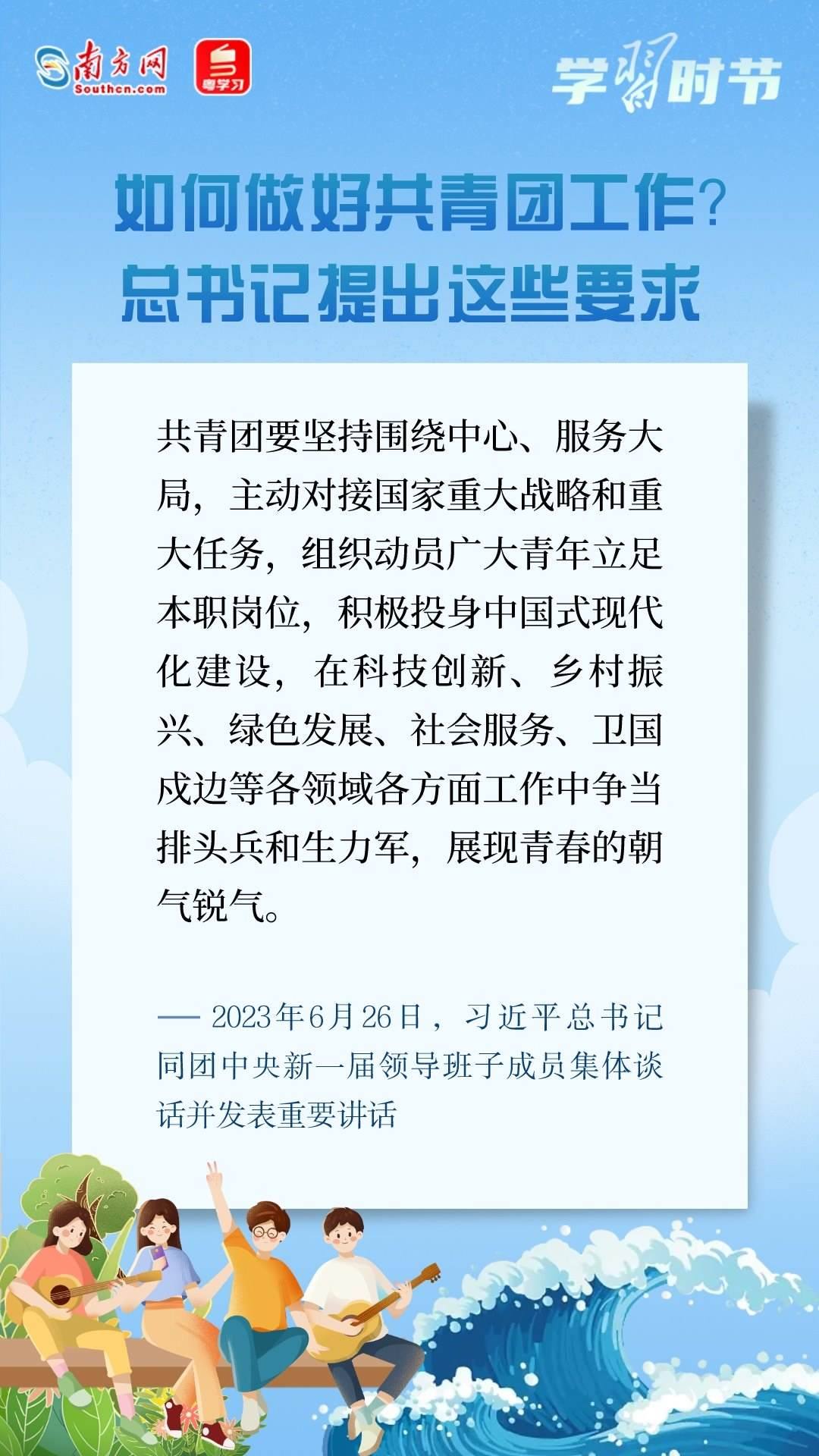 6月26日,習(xí)近平總書記同團(tuán)中央新一屆領(lǐng)導(dǎo)班子成員集體談話并發(fā)表重要講話??倳洀?qiáng)調(diào),黨和國家事業(yè)的希望寄托在青年身上。希望共青團(tuán)中央深入貫徹黨中央要求,切實(shí)肩負(fù)起新時代新征程黨賦予的使命任務(wù),傳承弘揚(yáng)優(yōu)良傳統(tǒng),堅(jiān)持改革創(chuàng)新,更好把青年一代團(tuán)結(jié)凝聚在黨的周圍,為推進(jìn)強(qiáng)國建設(shè)、民族復(fù)興偉業(yè)接續(xù)奮斗。