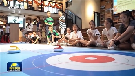 在紹興竹田頭村,偏遠村落的孩子們正在新建的農(nóng)家書屋里體驗冰壺課。
