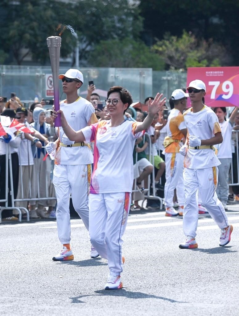 9月8日,火炬手羅雪娟在火炬?zhèn)鬟f中。當(dāng)日,杭州亞運(yùn)會火炬?zhèn)鬟f在杭州西湖涌金公園廣場啟動,共有106棒火炬手參與當(dāng)日傳遞。新華社記者孫非 攝