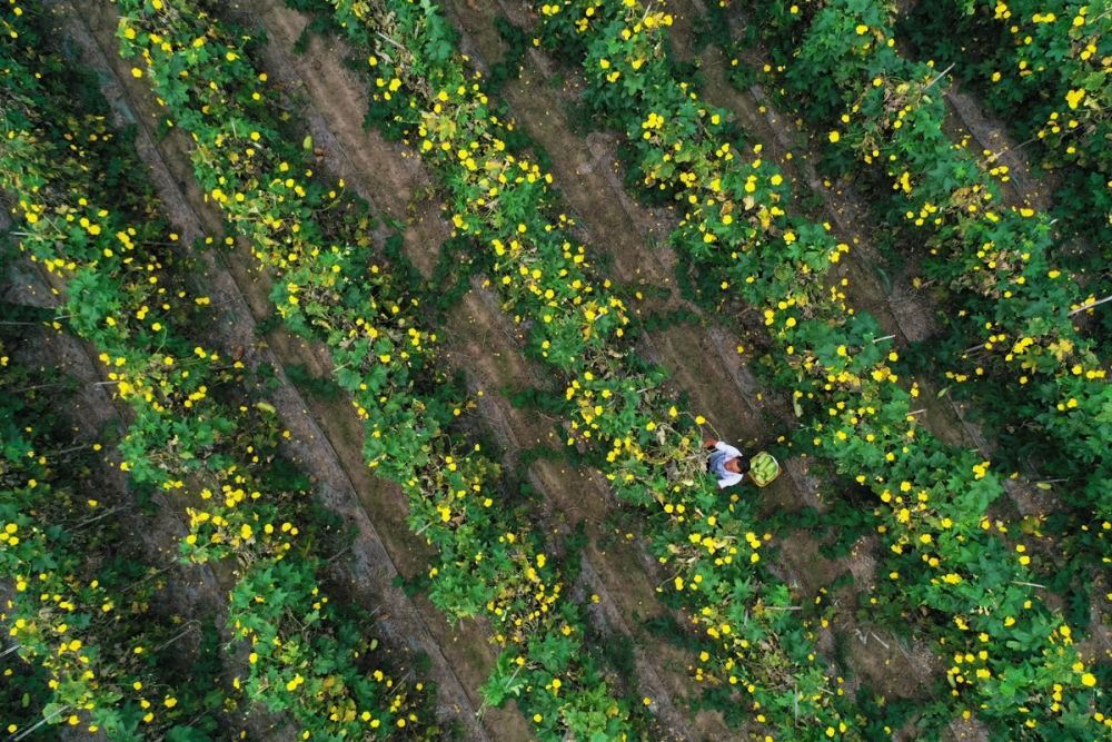 ↑2023年9月11日,湖南省常德市澧縣官垸鎮(zhèn)常發(fā)村,農民在采摘絲瓜。CICPHOTO/柏依樸 攝