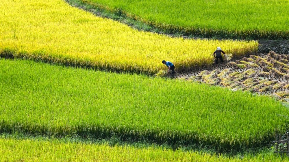 ↑2023年9月4日,湖南省東安縣舜皇山國家森林公園管理局塘家梯田,農民在收割稻谷。CICPHOTO/嚴潔 攝