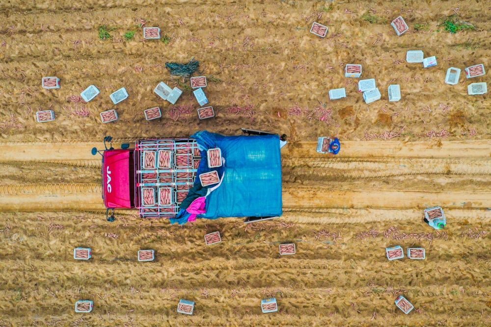 ↑2023年8月21日,河南省濮陽市清豐縣古城鄉(xiāng)齊家村,農民在將采收的紅薯裝筐。CICPHOTO/紀全舉 攝