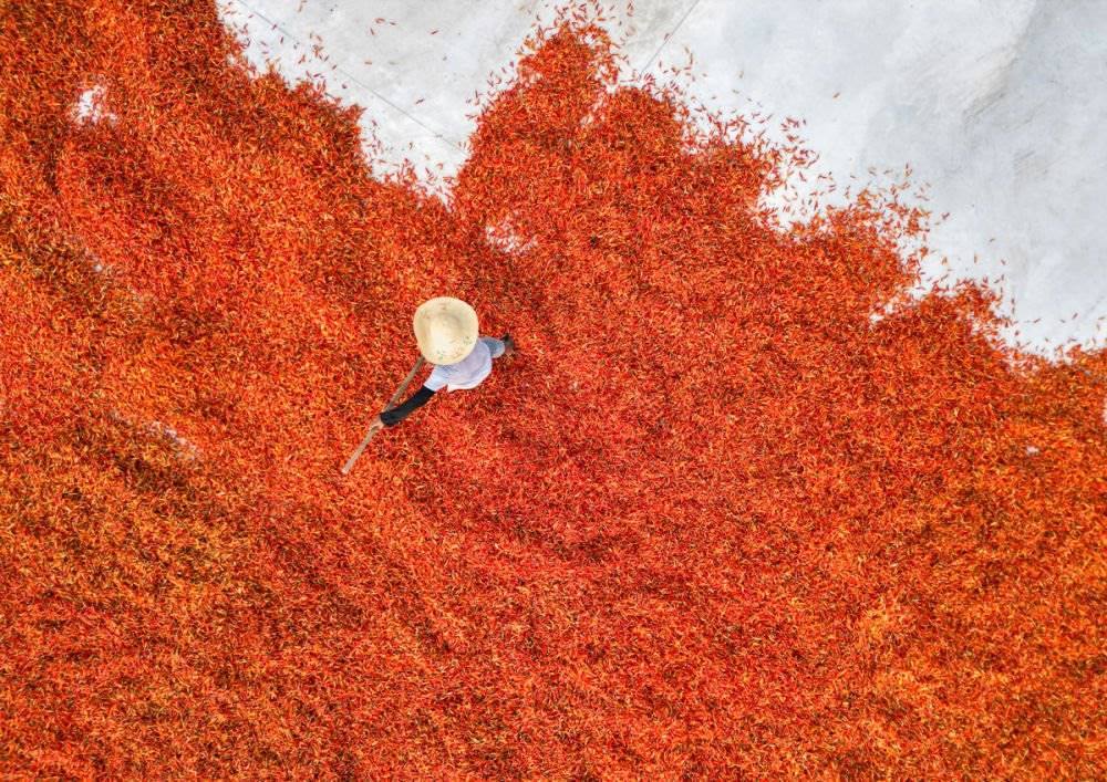 ↑2023年8月24日,安徽省亳州市譙城區(qū)古城鎮(zhèn)油河村,農民在晾曬辣椒。CICPHOTO/楊中勤 攝