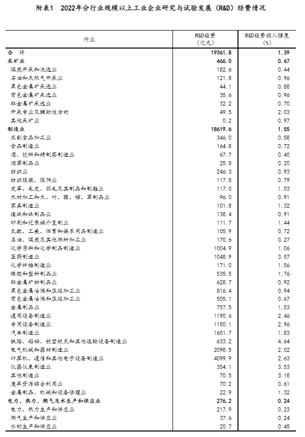 分產(chǎn)業(yè)部門看,高技術(shù)制造業(yè)研究與試驗(yàn)發(fā)展(R&D)經(jīng)費(fèi)6507.7億元,投入強(qiáng)度(與營業(yè)收入之比)為2.91%,比上年提高0.20個(gè)百分點(diǎn)。在規(guī)模以上工業(yè)企業(yè)中,研究與試驗(yàn)發(fā)展(R&D)經(jīng)費(fèi)投入超過千億元的行業(yè)大類有7個(gè),比上年增加2個(gè),這7個(gè)行業(yè)的經(jīng)費(fèi)占全部規(guī)模以上工業(yè)企業(yè)研究與試驗(yàn)發(fā)展(R&D)經(jīng)費(fèi)的比重為63.2%(詳見附表1)。