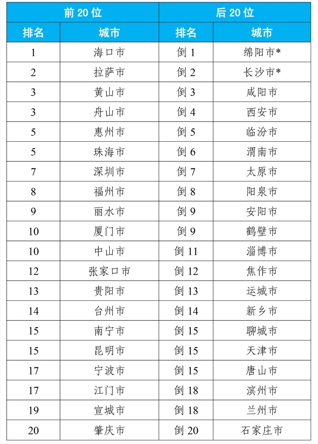 8月,168個(gè)重點(diǎn)城市中,空氣質(zhì)量排名前20位城市依次是拉薩、珠海和海口等城市(從第1名至并列第19名);空氣質(zhì)量排名后20位城市依次是太原、晉城和陽泉等城市(從倒數(shù)第1名至并列倒數(shù)第20名)。見附表1。