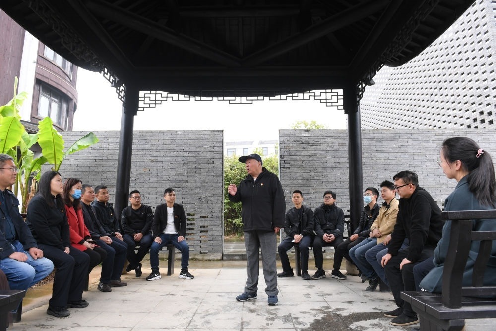 浙江紹興諸暨市楓橋鎮(zhèn)魏廉村老黨員魏杏根(中)在楓橋經(jīng)驗陳列館的亭子內(nèi)和年輕黨員分享當年運用“楓橋經(jīng)驗”化解基層矛盾的故事(2021年4月11日攝)。