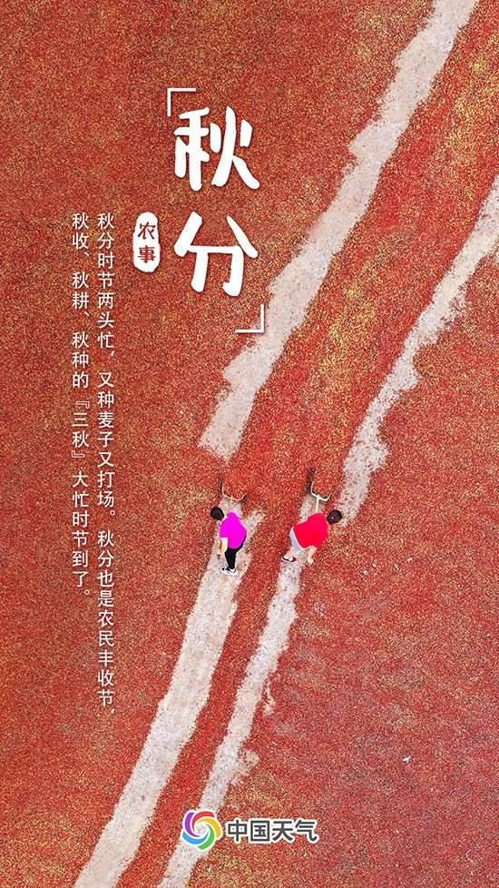 “秋分時(shí)節(jié)兩頭忙,又種麥子又打場(chǎng)?!鼻锓旨纫馕吨S收的喜悅,也是耕種的標(biāo)志。此時(shí)正是秋收、秋耕和秋種的“三秋”生產(chǎn)期,需重點(diǎn)防范初霜凍、華西秋雨、寒露風(fēng)、大霧等天氣對(duì)農(nóng)業(yè)生產(chǎn)方面可能造成的不利影響。