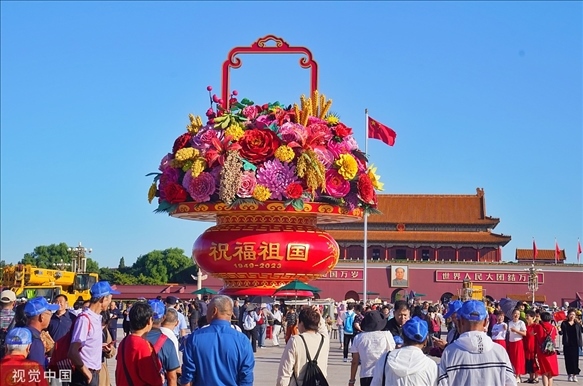 2023年9月22日上午,北京,“祝福祖國”巨型花籃在天安門廣場(chǎng)亮相。