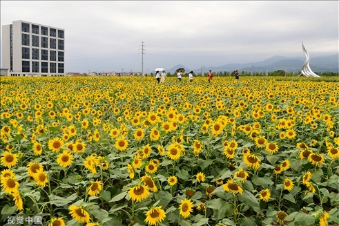 浙江金華,金東區(qū)東二環(huán)往金義快速路的東南側(cè),一大片向日葵迎來了盛開季。