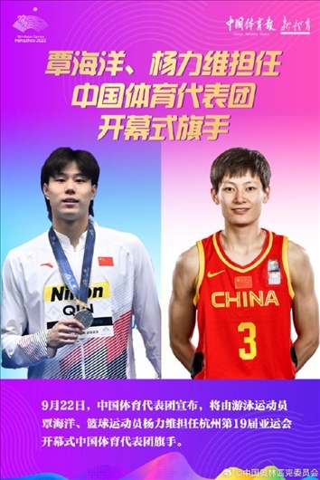 9月22日上午,中國體育代表團(tuán)宣布,將由游泳運(yùn)動(dòng)員覃海洋、籃球運(yùn)動(dòng)員楊力維擔(dān)任杭州亞運(yùn)會(huì)開幕式中國體育代表團(tuán)旗手。