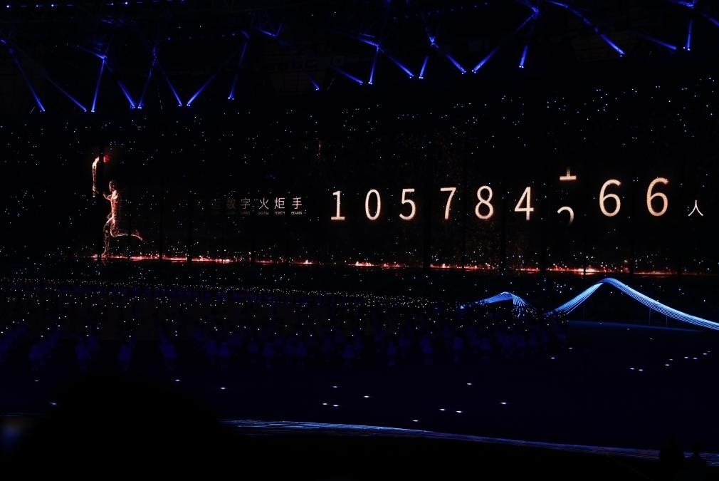 9月23日,數字火炬手在開幕式上進行火炬?zhèn)鬟f。新華社記者朱崢攝