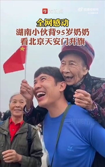 近日,湖南一名男子背著95歲的奶奶,從永州出發(fā)到北京天安門(mén)看升國(guó)旗??粗逍羌t旗冉冉升起,祖孫兩人露出了幸福的笑容。網(wǎng)友:這是“最美的風(fēng)景”。