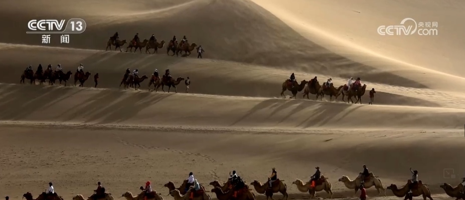 在甘肅酒泉,游客騎著駱駝在鳴沙山月牙泉景區(qū)游覽,在沙漠中體驗(yàn)異域風(fēng)情。