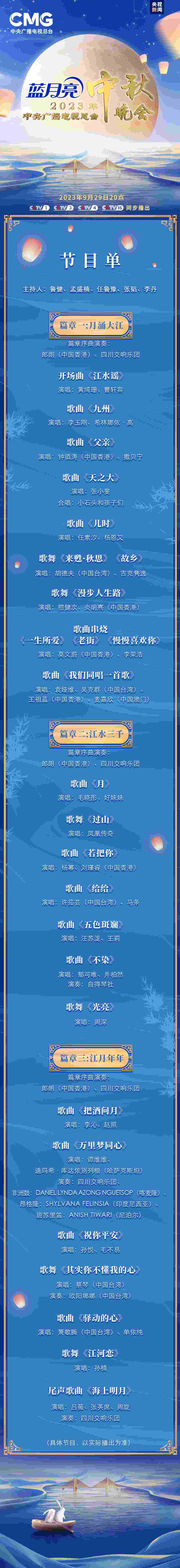 一年逢好夜,萬(wàn)里見(jiàn)明時(shí)。9月29日晚8時(shí),《中央廣播電視總臺(tái)2023年中秋晚會(huì)》將與全球受眾見(jiàn)面,晚會(huì)節(jié)目單正式發(fā)布。