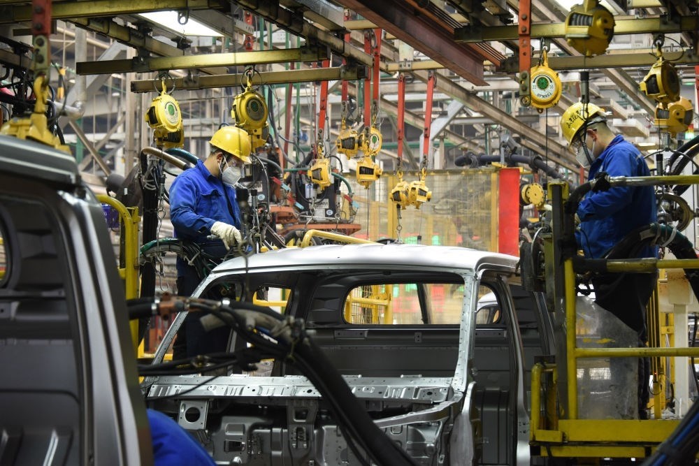 工人在山東自貿(mào)試驗(yàn)區(qū)青島片區(qū)一汽車制造企業(yè)車間內(nèi)生產(chǎn)汽車(2023年2月23日攝)。新華社記者 李紫恒 攝