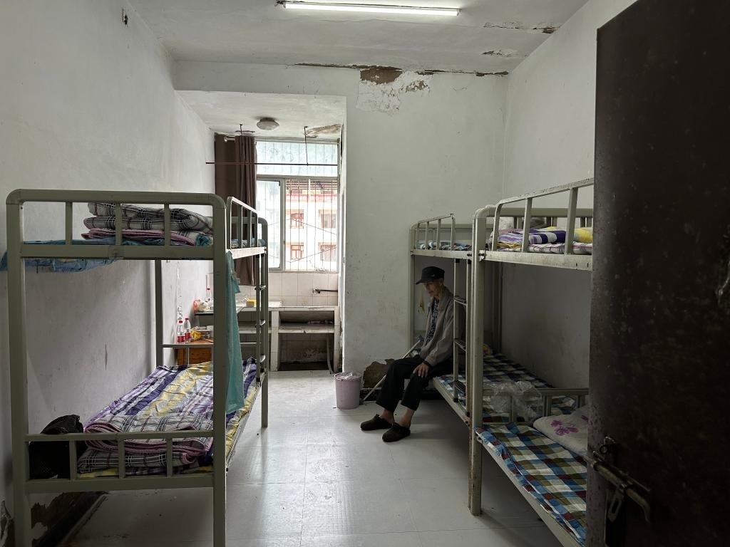 太白西村4組村民譚建和老爺爺行動(dòng)不便,坐在鋪著干凈格子床單的宿舍床上望向窗外?!扒疤煜挛?,社區(qū)的車來(lái)接的我和老伴,安置點(diǎn)吃喝都好,宿舍住起來(lái)也挺舒服。兒子們擔(dān)心我,他們過(guò)不來(lái),一天就打好幾通電話,我說(shuō)都好著呢、好著呢?!弊T爺爺說(shuō)。