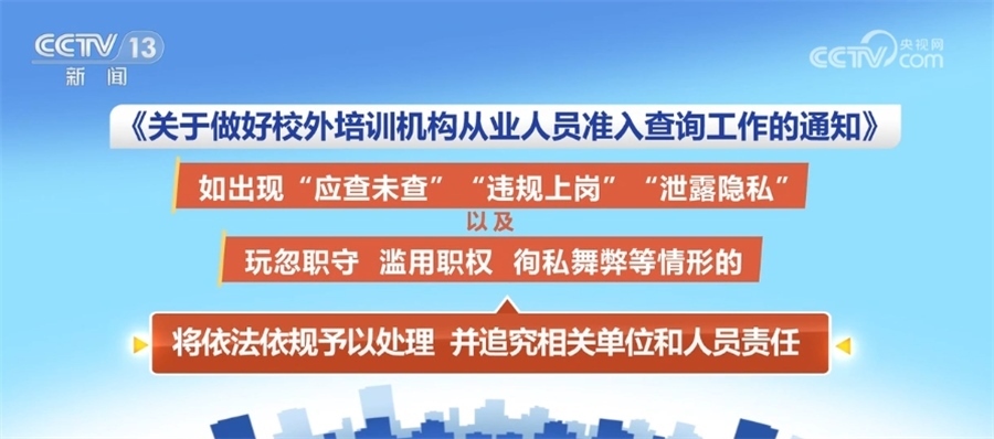 此外,《通知》強(qiáng)調(diào)嚴(yán)明查詢管理責(zé)任。各級教育部門和相關(guān)主管部門、校外培訓(xùn)機(jī)構(gòu)及其工作人員應(yīng)履行準(zhǔn)入查詢的法定職責(zé),如出現(xiàn)“應(yīng)查未查”“違規(guī)上崗”“泄露隱私”以及玩忽職守、濫用職權(quán)、徇私舞弊等情形的,將依法依規(guī)予以處理,并追究相關(guān)單位和人員責(zé)任。