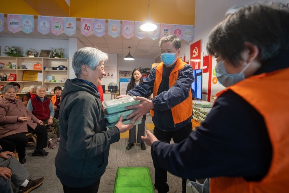 杭州市上城區(qū)南星街道白塔嶺社區(qū)志愿者在社區(qū)服務(wù)驛站為老人發(fā)放免費愛心午餐(2022年11月23日攝)。新華社記者 江漢 攝