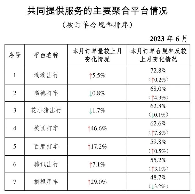 其中,面向乘客、與網約車平臺公司共同提供服務的平臺(俗稱“聚合平臺”)完成2.18億單,環(huán)比上升4.0%。按訂單合規(guī)率由高到低的分別是滴滴出行、高德打車、花小豬出行、美團打車、百度打車、騰訊出行、攜程用車。
