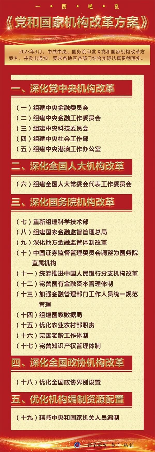2023年3月10日上午9時許,北京人民大會堂大禮堂。2900多名全國人大代表按下表決器,十四屆全國人大一次會議表決通過了關于國務院機構改革方案的決定,批準了根據(jù)《黨和國家機構改革方案》形成的國務院機構改革方案。6天后,《黨和國家機構改革方案》全文公開發(fā)布,向著強國建設、民族復興的宏偉目標,黨和國家機構改革揚帆破浪啟新程。