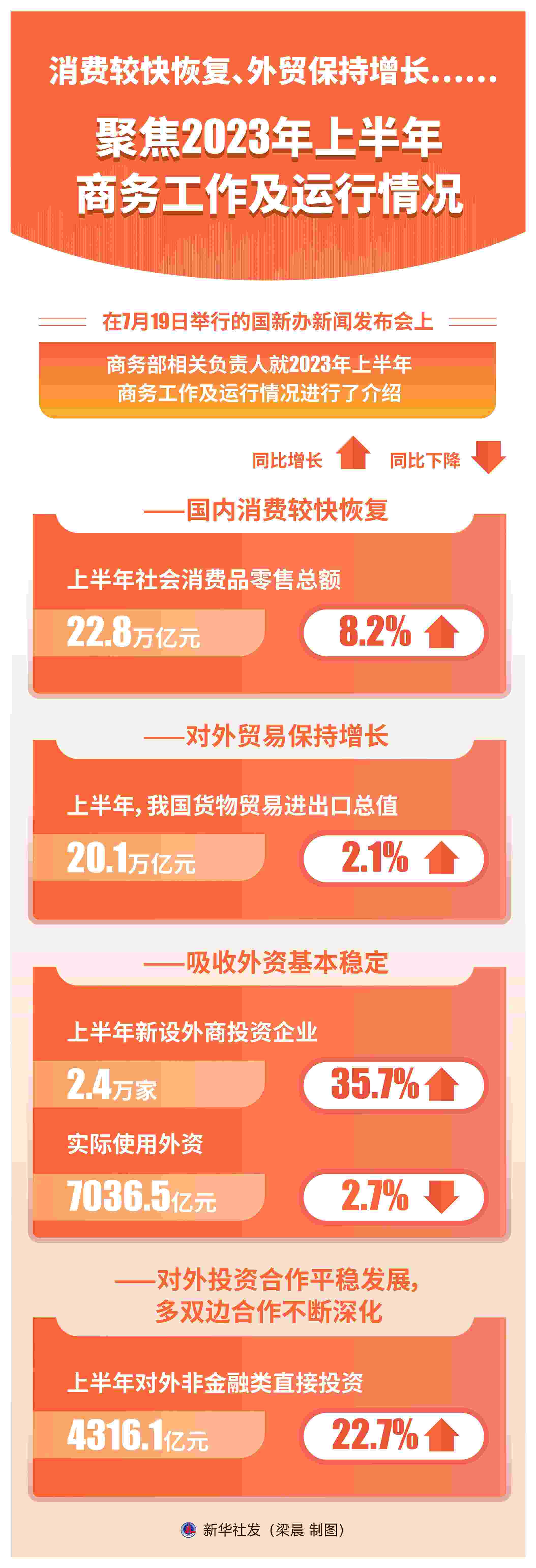 新華社北京7月19日電 題:消費較快恢復(fù)、外貿(mào)保持增長……聚焦2023年上半年商務(wù)工作及運行情況